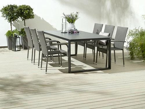 | Material | Ställning: Aluminium, Bordsskiva: DURAWOOD® kompositträ (polyetylen/hårdträfiber)DURAWOOD® kompositträ är ett underhållsfritt material med naturlig trälook. Det är tillverkat av en blandning av FSC hårdträfiber och plast, som ger ett slitstarkt och väderbeständigt material. DURAWOOD® är UV-skyddat vilket säkerställer en färgbeständig yta., Ben: Aluminium |