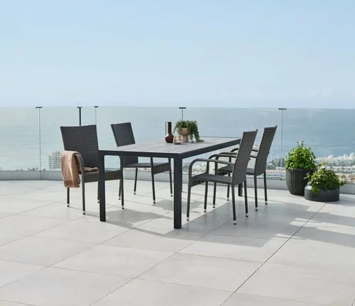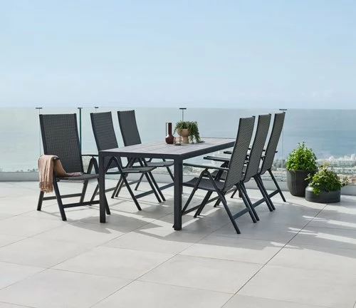 | Material | Ställning: Aluminium, Bordsskiva: Konstträ (polystyren)Konstträ är ett underhållsfritt, syntetiskt material med naturlig trälook. Det är tillverkat av plast, såsom polystyren, som ger ett slitstarkt och väderbeständigt material. Konstträ är UV-skyddat, vilket säkerställer en färgbeständig yta., Ben: Aluminium |