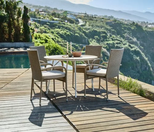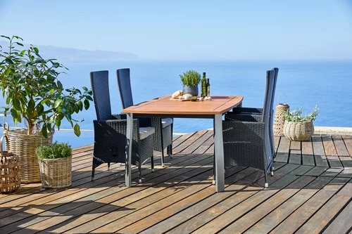 JUTLANDIA YTTRUP L150 Bord Hårdträ + 4 MADERNE Stapelstol Grå