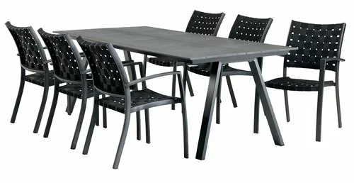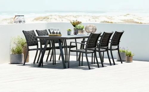 Bord: Aluminium och konstträ. B100 x L220 x H74 cm. Stol: Aluminium och UV-skyddad polypropylen. Stapelbar.