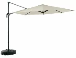Vattentålig, UV-skyddad polyesterduk och aluminiumstång. Med tiltfunktion, handvev och ventilation. Inkl. vattentåligt överdrag och fot. Ø300 x H245 cm