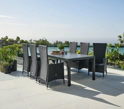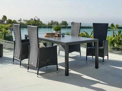 Bord: Aluminium och DURAWOOD® kompositträ, ett slitstarkt kompositmaterial som består av FSC® hårdträfiber och plast. B100 x L214 x H74 cm. Stol: Aluminium och konstrotting. Med steglös ryggjustering.