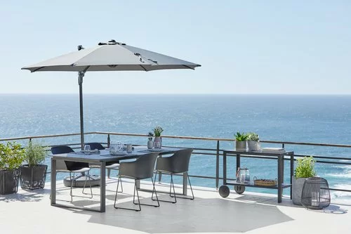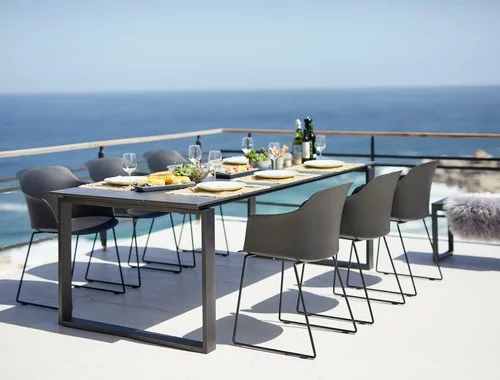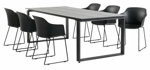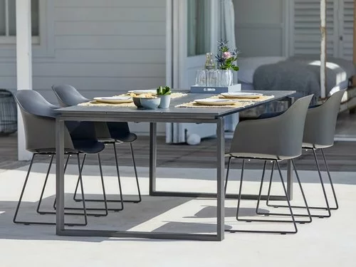 Bord: Aluminium och DURAWOOD® kompositträ, ett slitstarkt kompositmaterial som består av FSC® hårdträfiber och plast. B100 x L215 x H75 cm. Stol: Stål och formgjuten, UV-skyddad plast.