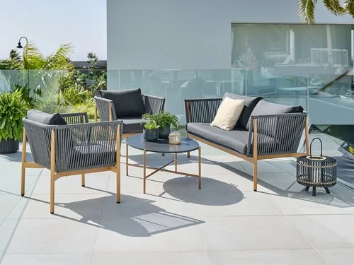 Bord: Aluminium och fibercement. B70 x L110 x H42 cm. 3-sits soffa och stol: Aluminium och UV-skyddad polyester. Inkl. exklusiva dynor med snabbtorkande, strukturvävt överdrag. Överdraget har ett vattentätt skikt på insidan, som hindrar vatten från att komma in i dynan.