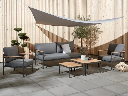 Bord: Aluminium och oljat FSC® hårdträ. B72/62 x L72/62 x H39/32 cm. 3-sits soffa och stol: Aluminium och oljat FSC® hårdträ. Inkl. exklusiva dynor med slitstarkt, strukturvävt överdrag.