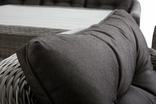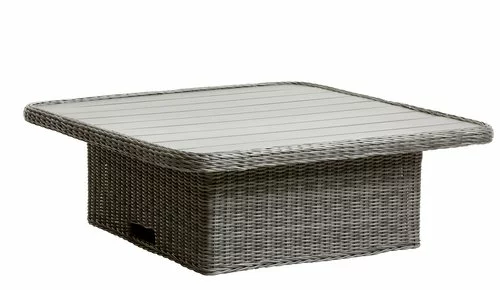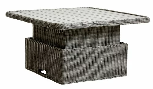 Bord: Aluminium, DURAWOOD® kompositträ och konstrotting. DURAWOOD® är ett slitstarkt kompositmaterial som består av FSC® hårdträfiber och plast. Justerbar höjd. B121 x L121 x H44/67 cm. 5-sits soffa: Aluminium och konstrotting. Kan ej spegelvändas. Inkl. exklusiva dynor med slitstarkt, strukturvävt överdrag.