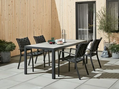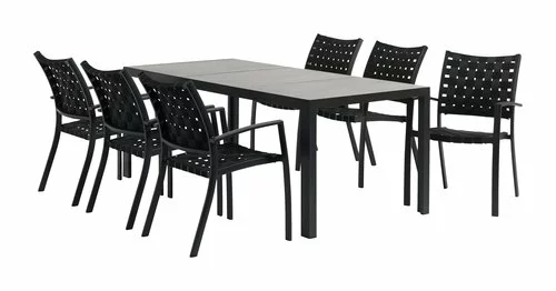 Bord: Aluminium och keramik. B90 x L195 x H74 cm. Stol: Aluminium och UV-skyddad polypropylen. Stapelbar.