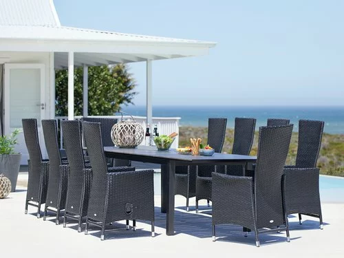 Bord: Aluminium och DURAWOOD® kompositträ, ett slitstarkt kompositmaterial som består av FSC® hårdträfiber och plast. Inkl. 2 klaffar som kan förvaras under bordsskivan. B95 x L214/315 x H77 cm. Stol: Aluminium och konstrotting. Med steglös ryggjustering.