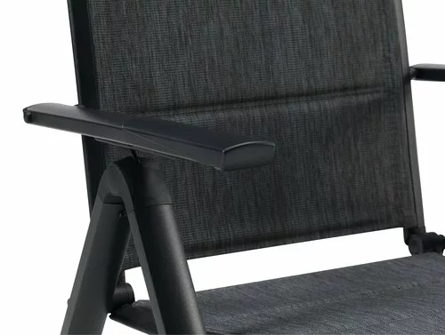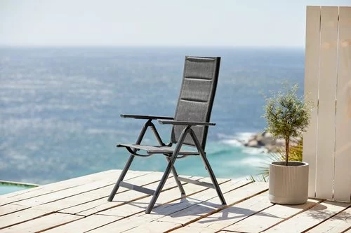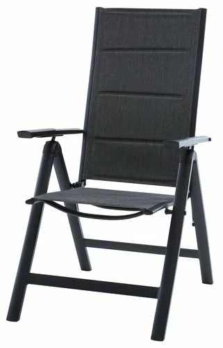 Aluminium, textilene och snabbtorkande skumstoppning. 6 positioner. Hopfällbar.