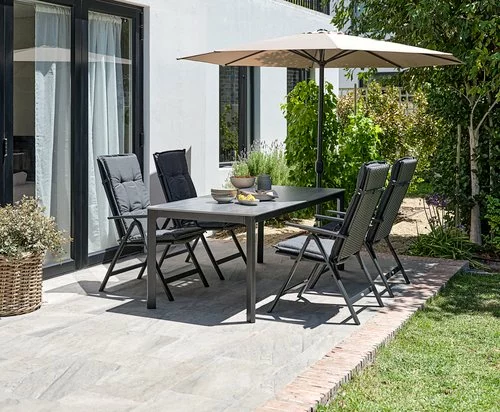 Aluminium och konstrotting. 6 positioner. Hopfällbar.