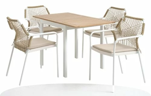 Bord: Aluminium och oljat FSC® hårdträ. Med 1 klaff. B70 x L75/126 x H75 cm. Stol: Aluminium, textilene och konstrotting. Inkl. kvalitetsdyna med slitstarkt överdrag. Stapelbar.
