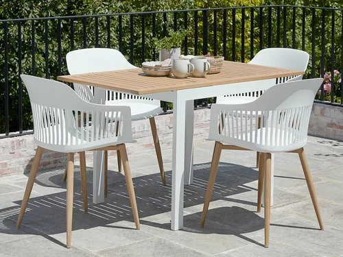 Bord: Aluminium och oljat FSC® hårdträ. Med 1 klaff. B70 x L75/126 x H75 cm. Stol: Stål och formgjuten, UV-skyddad plast.