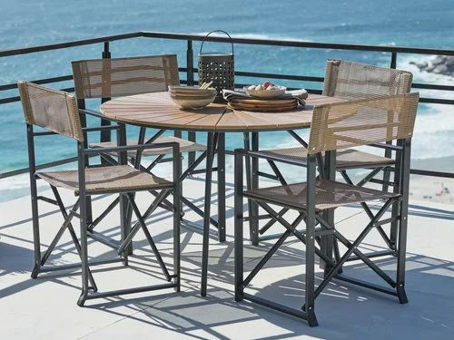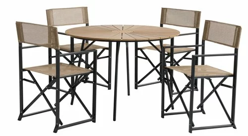 Bord: Aluminium och konstträ. Ø110 x H74 cm. Stol: Stål och textilene. Hopfällbar.