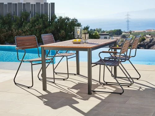 Bord: Aluminium och oljat FSC® hårdträ. B90 x L150 x H75 cm. Stol: Aluminium och oljat FSC® hårdträ. Stapelbar.