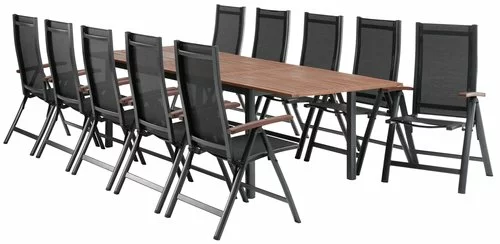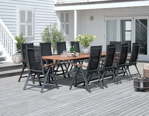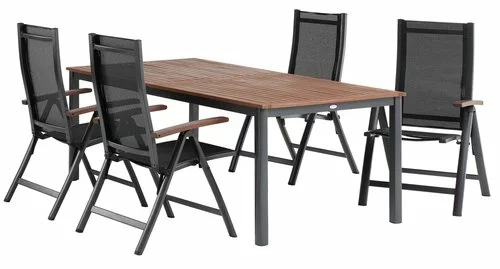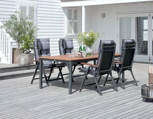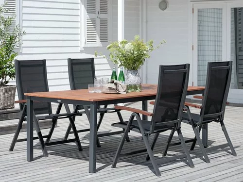 Bord: Aluminium och oljat FSC® hårdträ. Inkl. 1 klaff, som kan förvaras under bordsskivan. B100 x L210/300 x H75 cm. Stol: Aluminium, textilene och oljat FSC® hårdträ. 6 positioner. Hopfällbar.