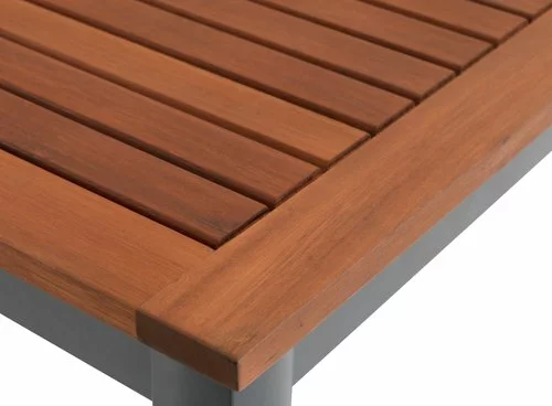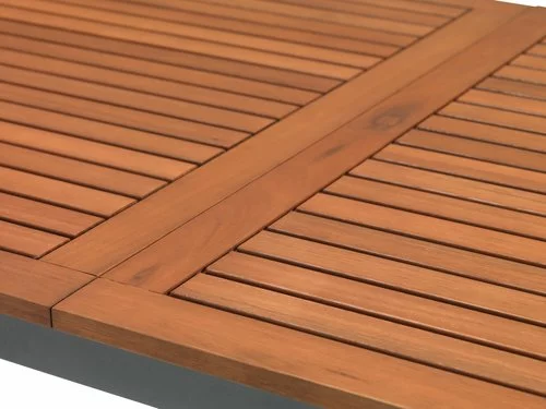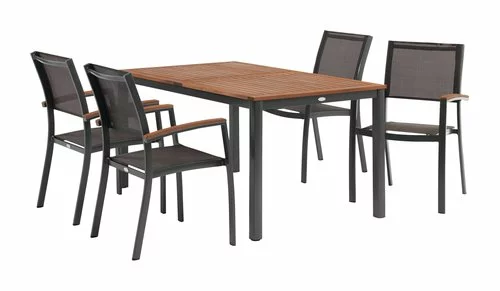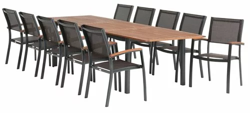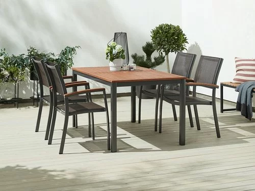 Bord: Aluminium och oljat FSC® hårdträ. Inkl. 1 klaff, som kan förvaras under bordsskivan. B100 x L210/300 x H75 cm. Stol: Aluminium, textilene och oljat FSC® hårdträ. Stapelbar.