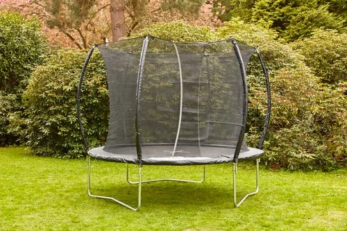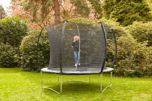 | Studsmatta funktioner | Säkerhetsnät H182 cm, Överlappande, självstängande ingång, 1,7 cm tjock UV-beständig kantdyna med skumkärna och slitstarkt gummiöverdrag, Stänger med skumstoppning och slitstarkt gummiöverdrag, 60 galvaniserade stålfjädrar, Galvaniserad stålram, Väderbeständig hoppmatta |